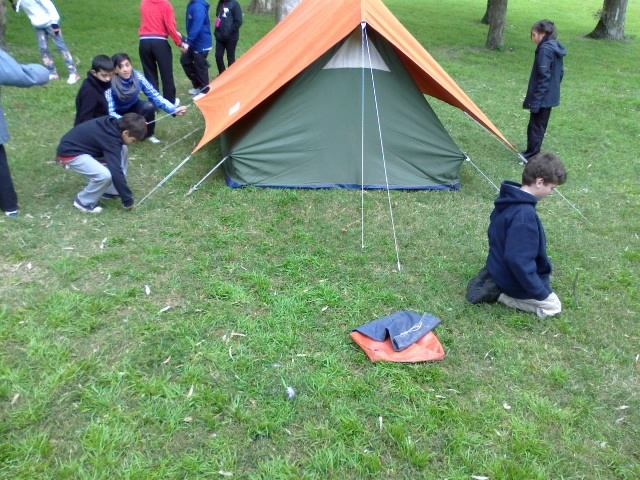 - Levanta la tienda y sujétala bien, colocando las estacas en el suelo. Recuerda que debes pensar bien en qué dirección irá la entrada a la carpa.