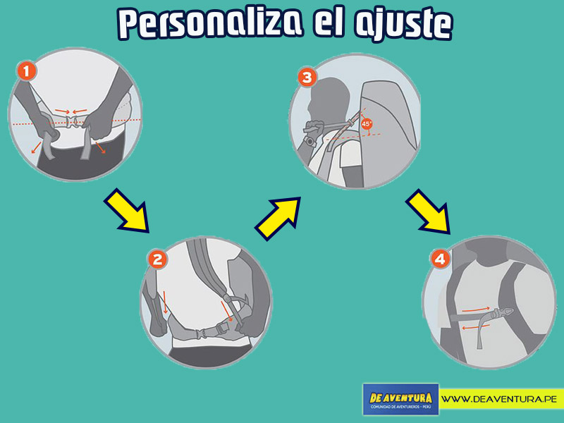 1. Cinturón Lumbar: Poner la mochila en la espalda para que el cinturón lumbar está descansando sobre sus huesos de la cadera. Cierra la hebilla del cinturón lumbar y ajústalo. Debes sentir la mayor parte del peso de la mochila en tus caderas y no sobre tus hombros. 2. Las correas del hombro: Tire hacia abajo y atrás en los extremos de las correas de los hombros para apretarlos. Las correas deben ajustarse perfectamente a sostener el equipaje contra su espalda, manteniendo así la carga hacia adelante. Los hombros no deben llevar el peso. 3. Elevadores de carga: Los elevadores de la carga se encuentran justo en la parte superior de los hombros y deben estar orientados hacia el cuerpo. El equipaje debe estar en un ángulo de 45° en relación a nuestro cuerpo. 4. Esternón Correa: Debes ajustarlo a una altura cómoda sobre el pecho y asegurar la hebilla, según sea necesario. Luego tienes que apretarla hasta que la correa del hombro se acomode hacia el interior de sus hombros, permitiendo que los brazos se muevan libremente. 5. Ajustes finales: Tire de las correas estabilizadoras, ubicadas a cada lado del cinturón lumbar, acomodando el cuerpo hacia la mochila. Regule el cinturón lumbar para estabilizar la carga. Esto asegura que la mayor parte del peso descanse sobre las caderas
