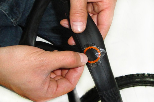 4- Coloca el parche. Esta es la parte en la que debes prestar atención a todos los detalles. Para pegar el parche, primero debes lijar suavemente la zona del agujero para que el parche agarre mejor. Segundo, debes mantener la cámara tensa para que el parche pegue correctamente. Luego, agregamos una buena cantidad de pegamento sobre el lugar del pinchazo y lo dejamos secar por entre 30 segundos a 1 minuto y medio. Ahora, colocamos el parche y lo pegamos ejerciendo con mucha fuerza sobre la cámara por aproximadamente 10 minutos.Foto: 4.bp.blogspot