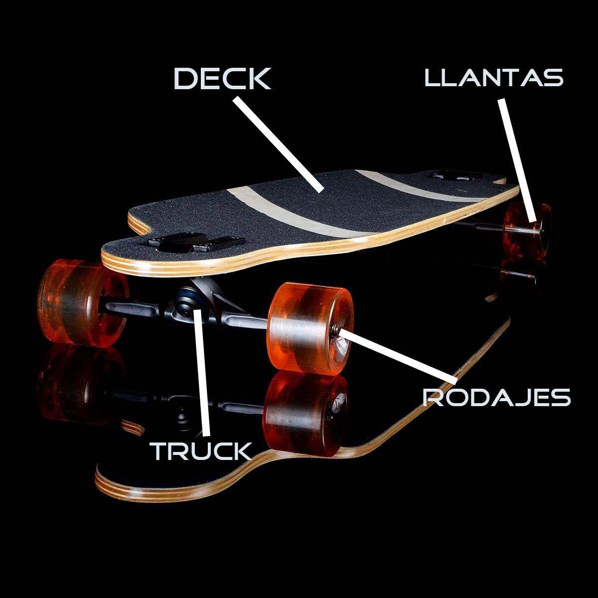 - Tabla o Deck: Existen muchas formas y tamaños, su longitud oscila entre las 35 y 45 pulgadas, la forma de la tabla influye mucho en el estilo que desees practicar. Necesitan una lija adherida para evitar el deslizamiento de los pies.